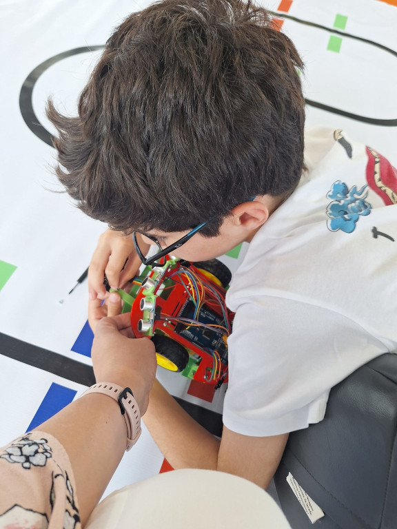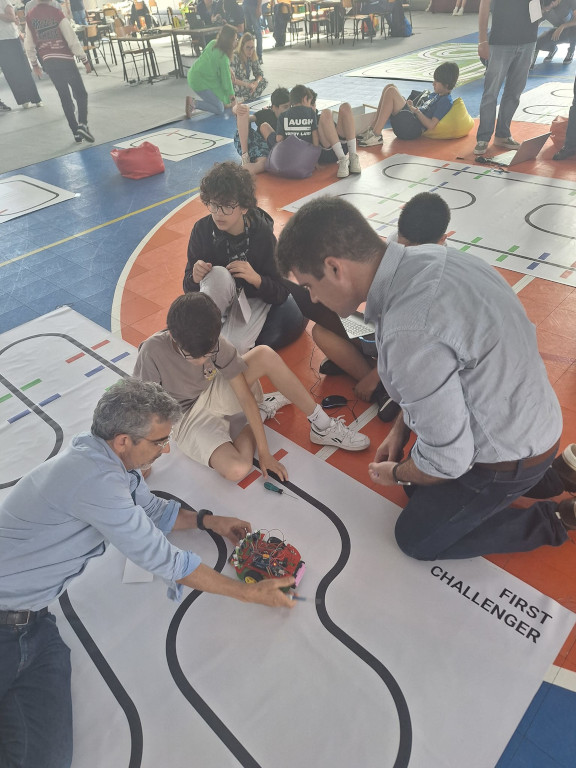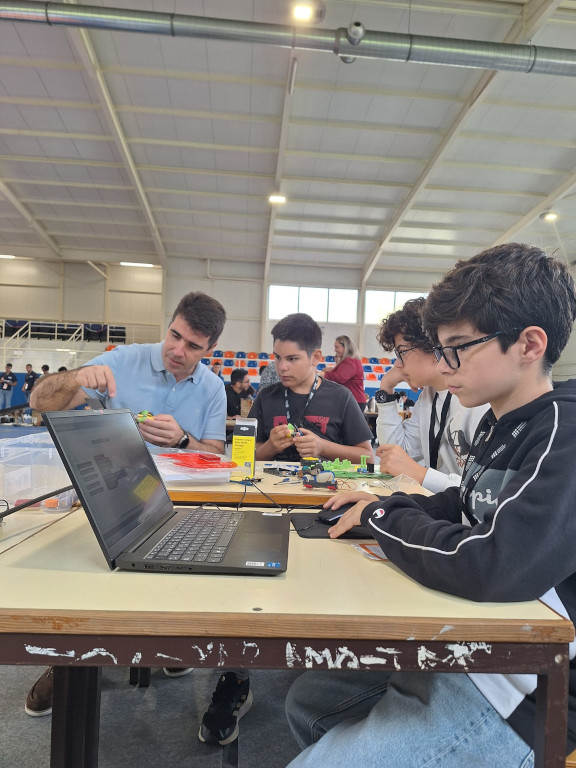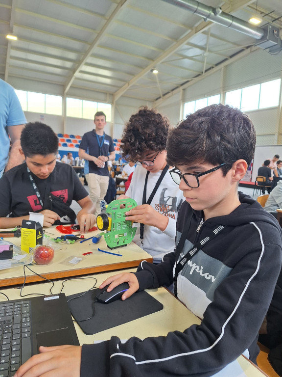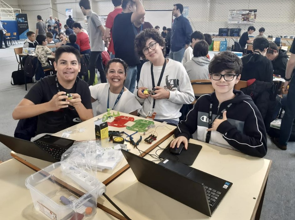 A equipa ESAQBot α, constituída pelos alunos Afonso Campos (7.º B), Afonso Sardinha (7.º B) e Francisco Sousa (8.º A), competiu no desafio First Challenger que tem como objetivo construir um robô e testá-lo em provas com diferentes graus de dificuldade: seguir linha, identificar cores e evitar obstáculos.